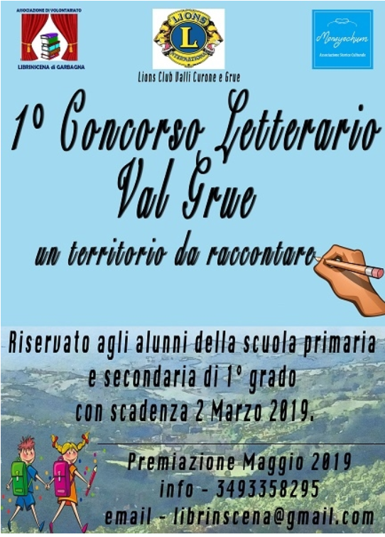 Bando del concorso letterario Val Grue: "VAL GRUE, un territorio da raccontare", organizzato in collaborazione con l'ASSOCIAZIONE STORICO-CULTURALE MONSYOCHUM di Montegioco e con il LIONS CLUB VALLI CURONE GRUE, aperto agli alunni delle scuole primarie e secondarie di primo grado, con scadenza 2 marzo 2019.