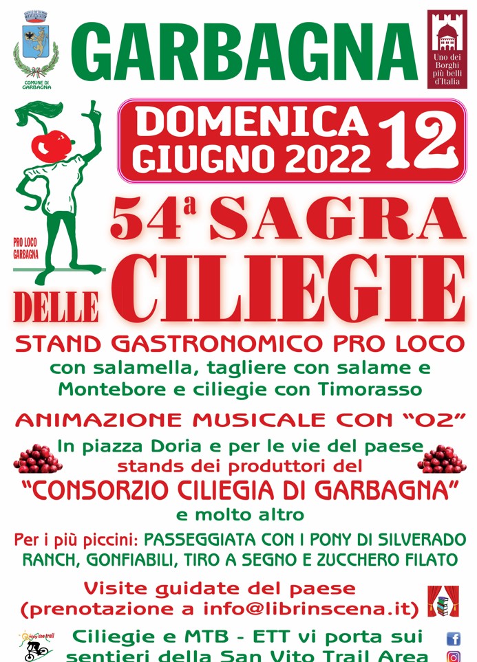 Torna dopo due anni di assenza l'abituale Sagra delle Ciliegie giunta alla 54° edizione. Nella cornice di uno dei Borghi più belli d'Italia la Ciliegia di Garbagna diventa Regina. A farle da contorno stand gastronomici, animazione musicale, intrattenimento per i più piccini, hobbisti e commercianti. Possibilità di visite guidate del Borgo ed escursioni ciclistiche.