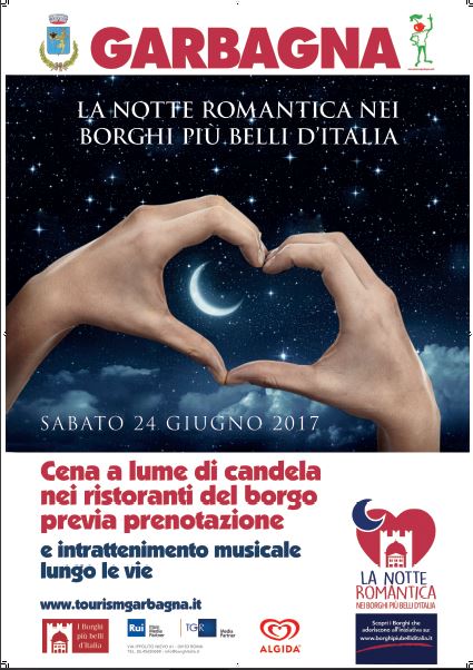 Dopo la riuscitissima prima edizione, il Comune di Garbagna in collaborazione con l'associazione "I Borghi più Belli d'Italia", promuovono "LA NOTTE ROMANTICA"; cena a lume di candela presso tutti i ristoratori del borgo, con intrattenimento musicale lungo le vie. Prenotazione obbligatoria.