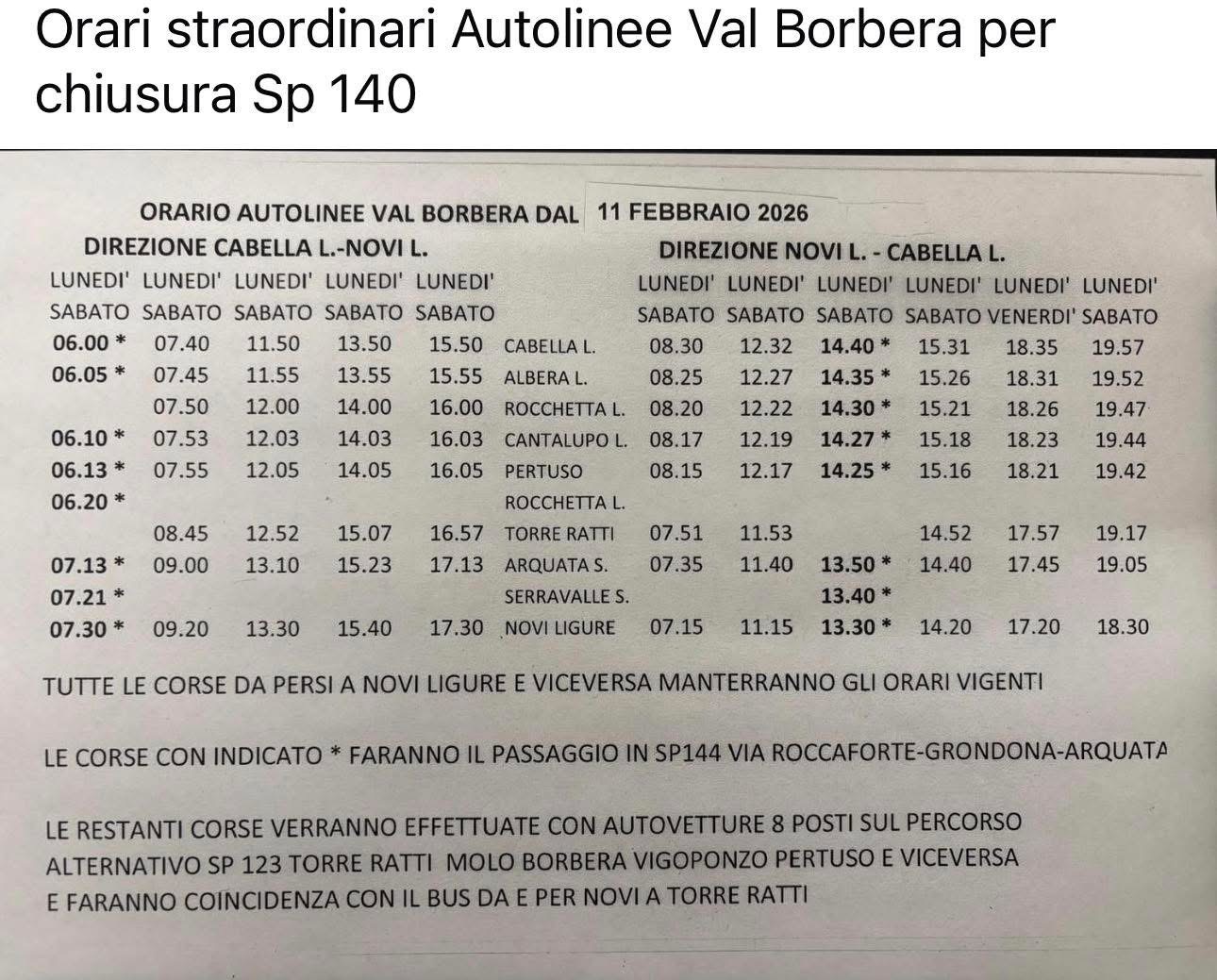 Orari straordinari Autolinee Val Borbera per chiusura SP 140