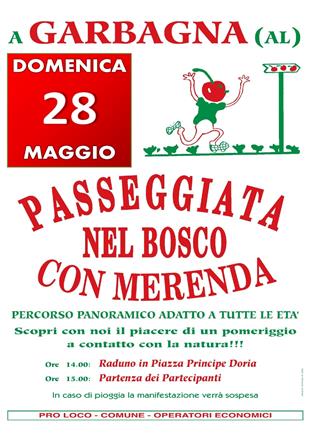 Torna domenica 28 Maggio la tradizionale passeggiata con merenda nel bosco. Camminata adatta a tutta la famiglia con bellissimo percorso attorno al Borgo di Garbagna e gustosa merenda distribuita ad ogni partecipante.