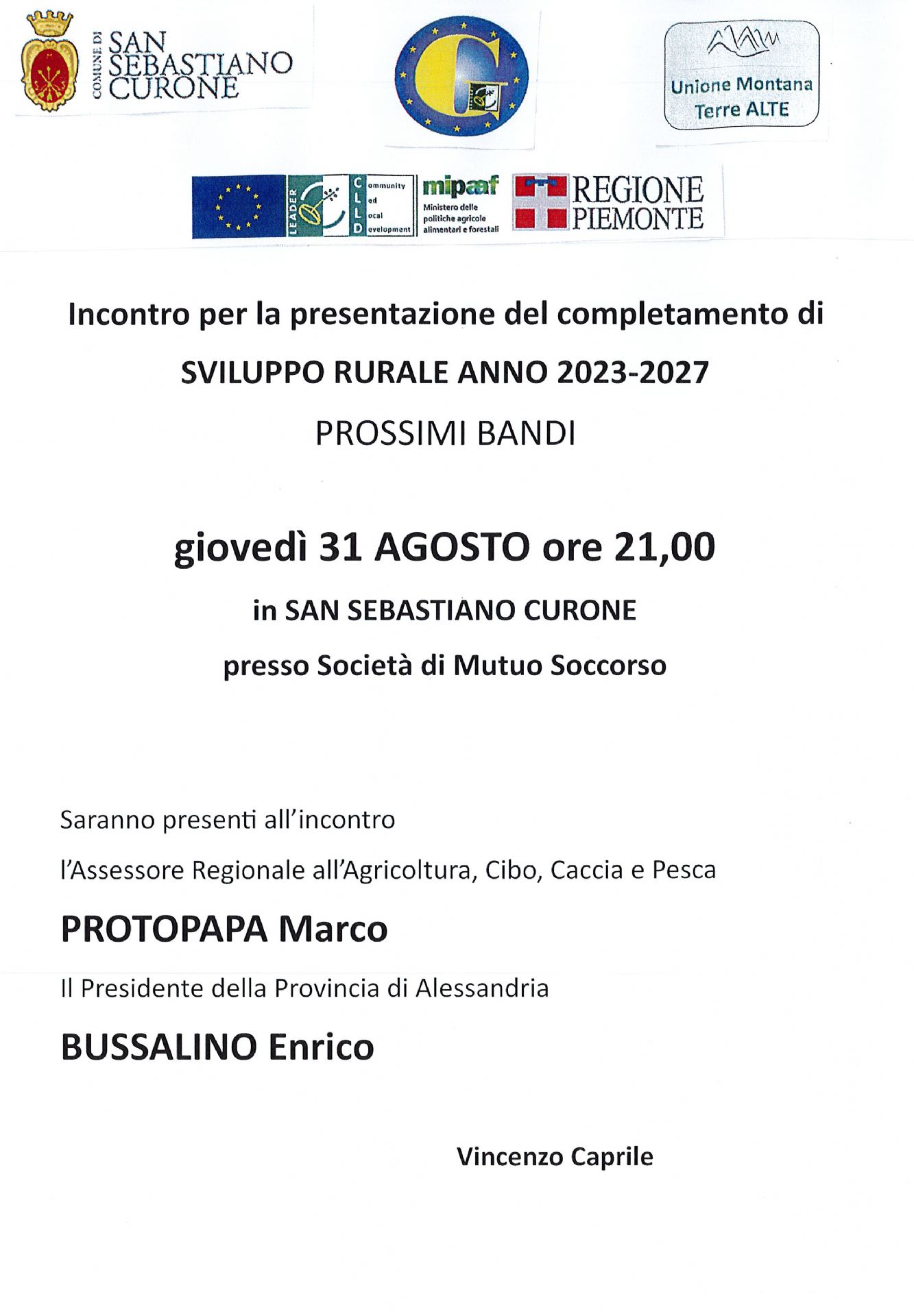 giovedì 31 agosto alle ore 21,00 presso la società di mutuo soccorso l'Assessore Regionale allì'agricoltura PROTOPAPA Marco e il Presidente della Provincia di Alessandria BUSSALINO Enrico presenteranno il completamento di SVILUPPO RURALE Anno 2023-2027