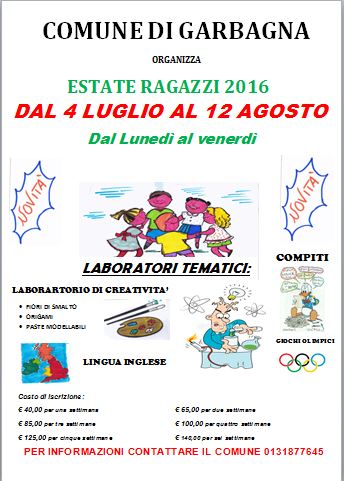 Anche quest'anno il Comune di Garbagna organizza presso i locali della Scuola Materna il centro estivo per bambini dai 3 -anche se non ancora compiuti - agli 11 anni. Maggiori informazioni sulla locandina allegata.