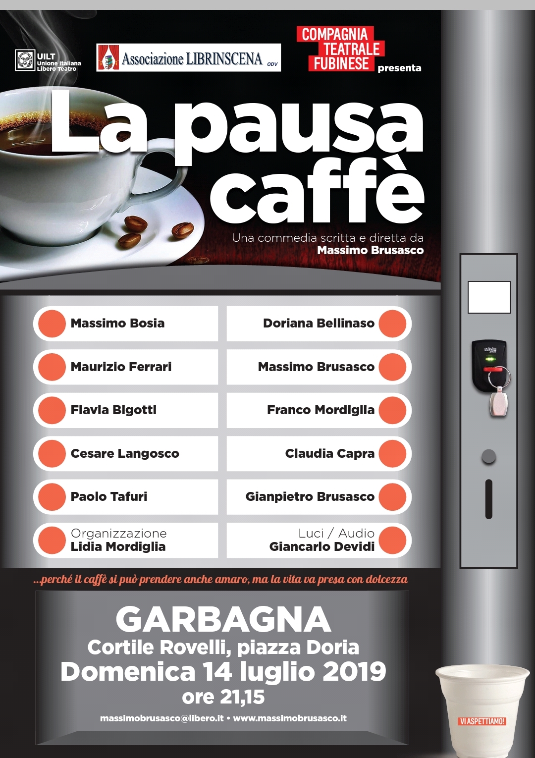 Un ufficio anagrafe di un comune qualsiasi. Tre impiegati tutt’altro che indefessi, un capo preoccupato dopo l’annuncio un’ispezione ministeriale. E poi un aspirante suicida, che arriva a scombussolare i piani, utenti giustamente impazienti e un rumeno tuttofare. C’è anche la signora delle pulizie che combatte chi, complice anche la pioggia incessante, vanifica il suo lavoro. Sono questi gli ingredienti della commedia “La pausa caffè”, due atti di Massimo Brusasco