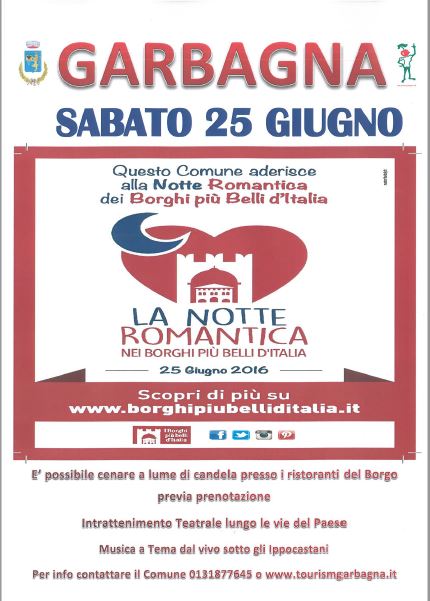 Il Comune di Garbagna aderisce all'iniziativa promossa dall'associazione "I Borghi più belli d'Italia" denominata "Notte Romantica".