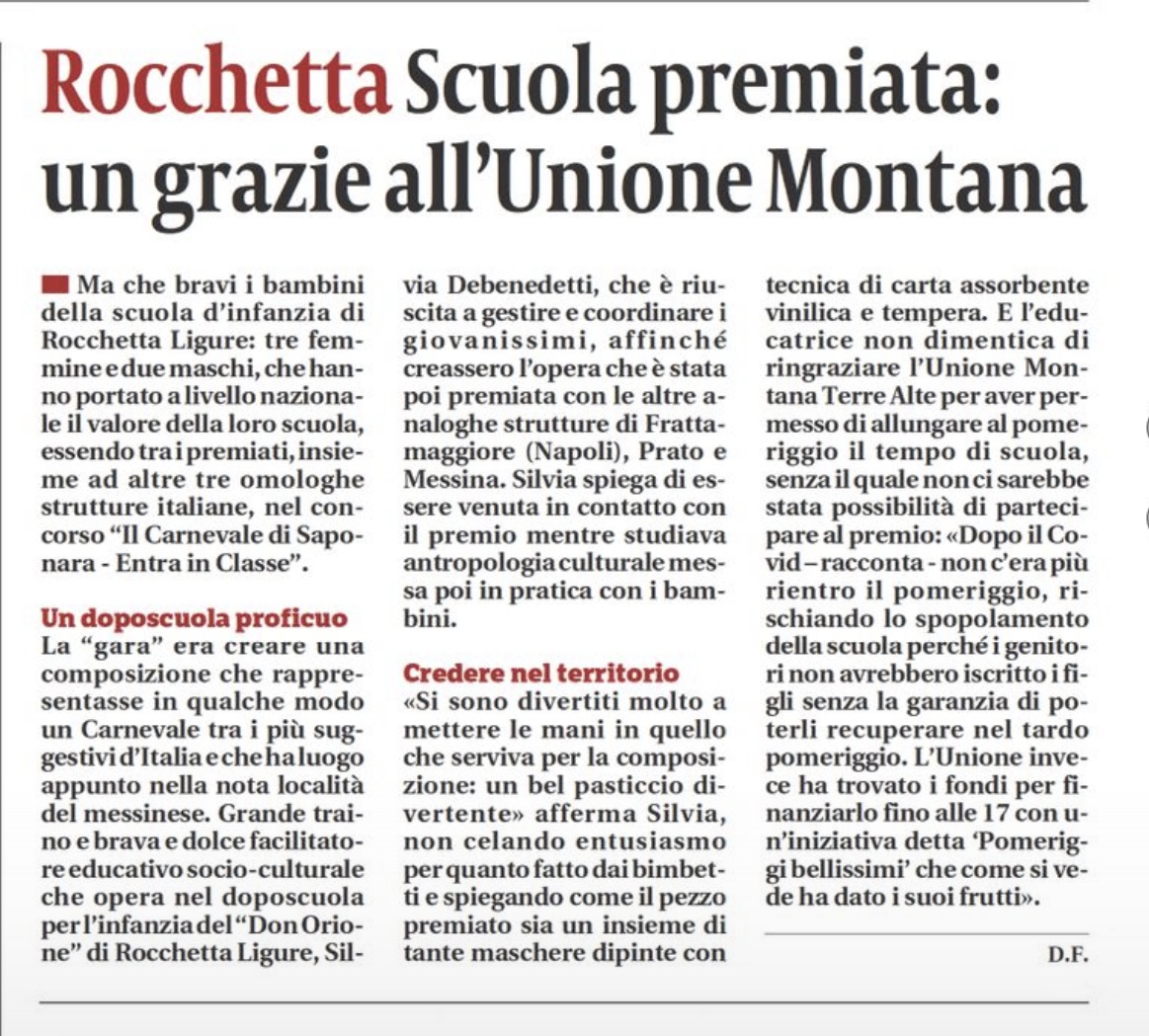"Rocchetta Scuola premiata. Un grazie all'Unione Montana"